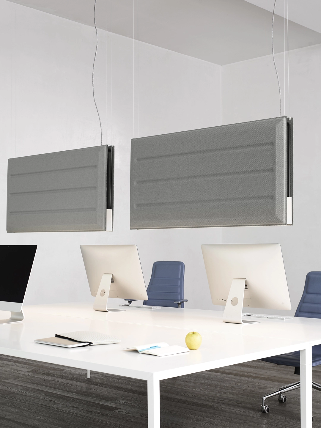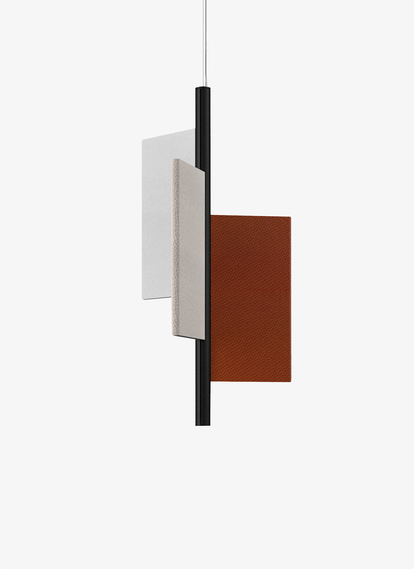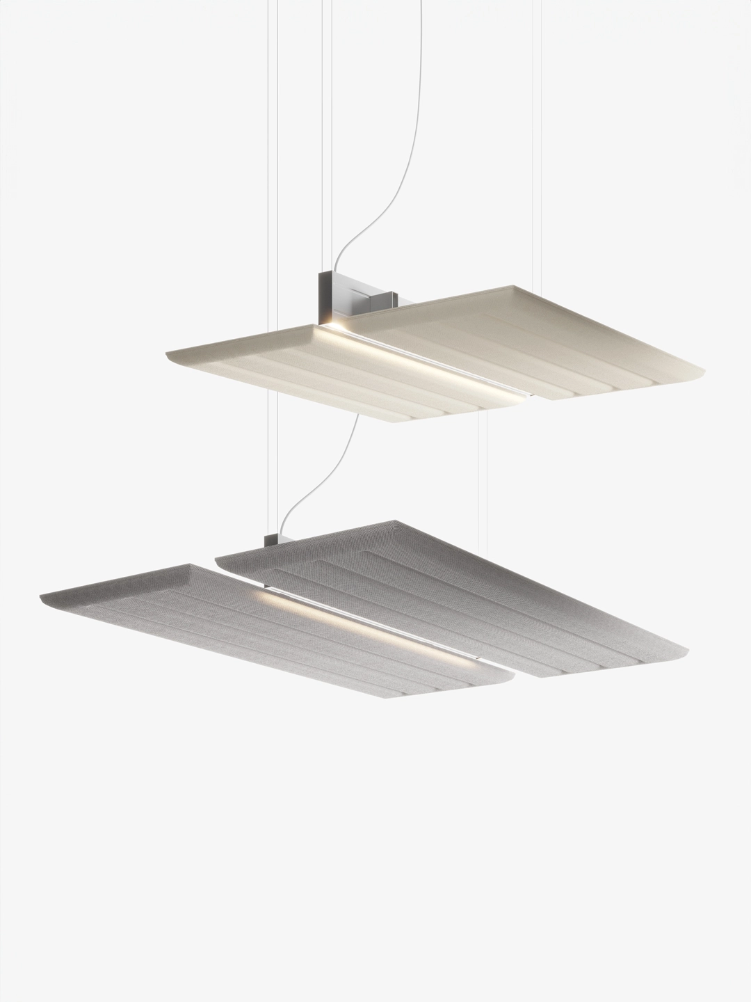 Designed by Monica ArmaniThe two “wing” panels in sound absorbing material can be positioned vertically or horizontally to create a partition or a large ceiling element. The two solutions address issues of lighting, sound absorption and the upper facing of spaces in a single strategy, eliminating the need for suspended ceilings.