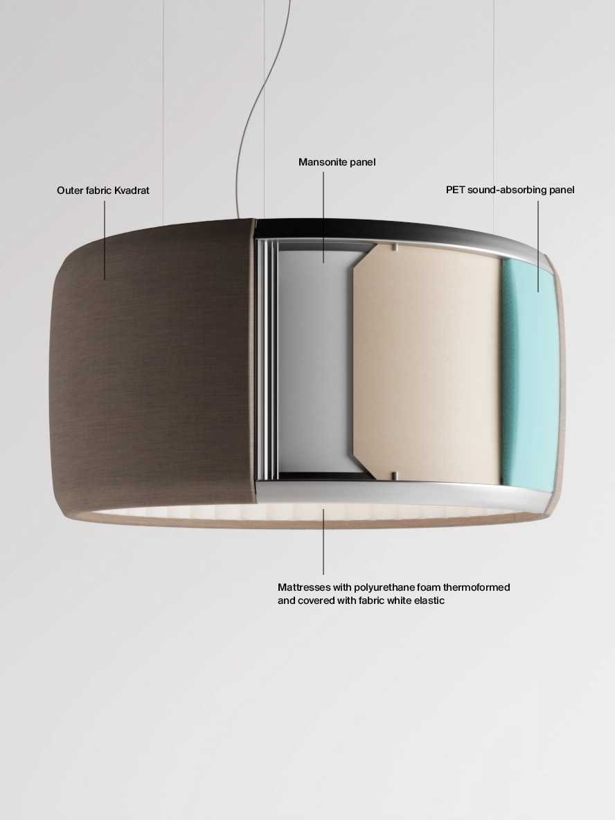 The materials used in Luceplan Acoustics provide sound absorption and prevent acoustic overlap, particularly in the case of human voices, which lies in the frequency range between 200 and over 3000 hertz (Hz).