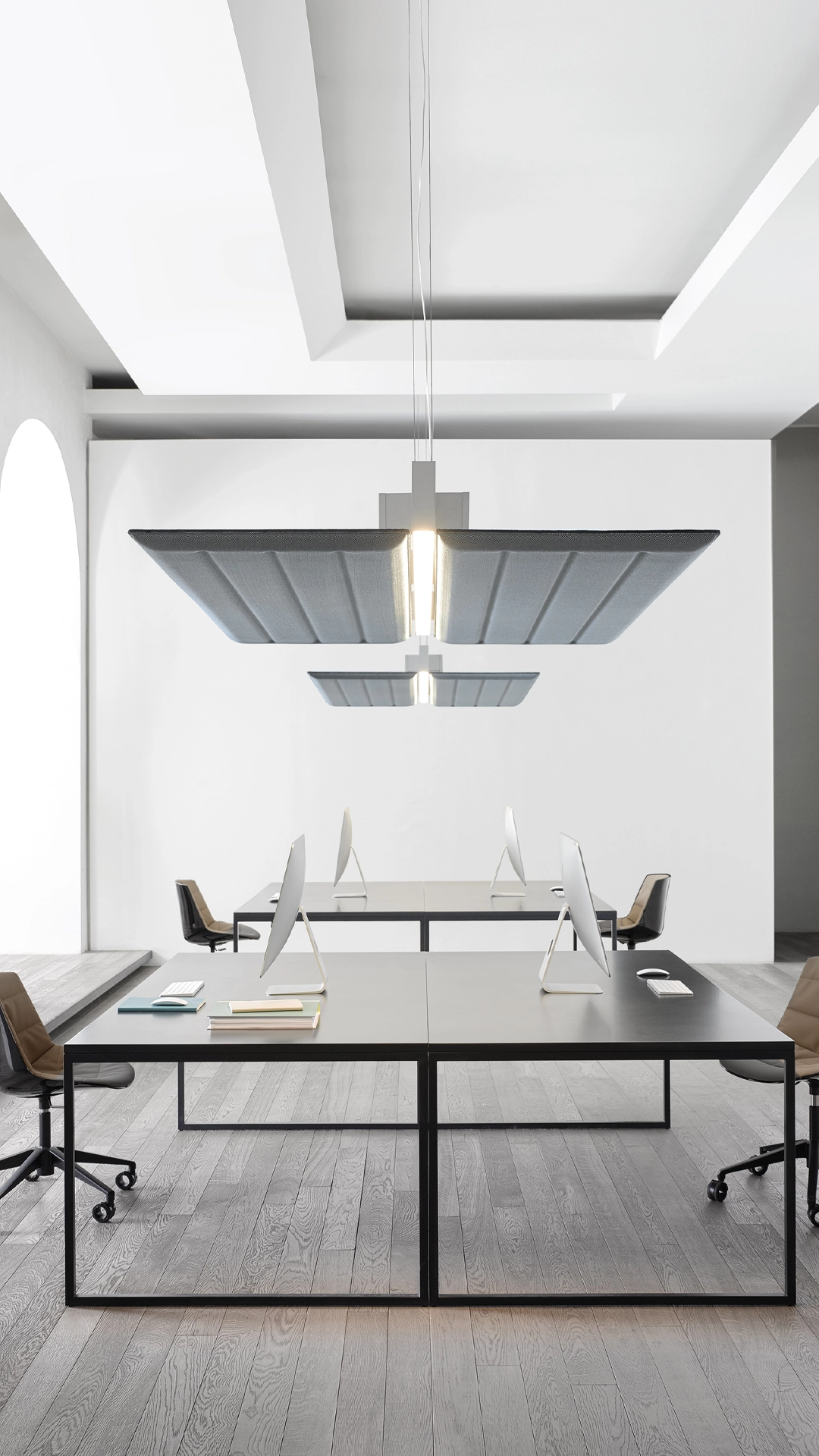 Dal 2012 Luceplan vanta una consolidata esperienza in soluzioni “all-in-one” che combinano alte prestazioni illuminotecniche, elevate prestazioni di fono-assorbenza e un design di alto livello per ogni ambiente.